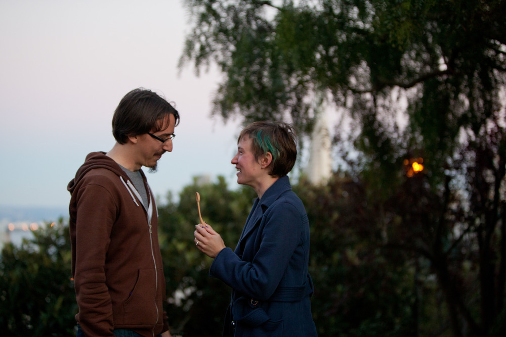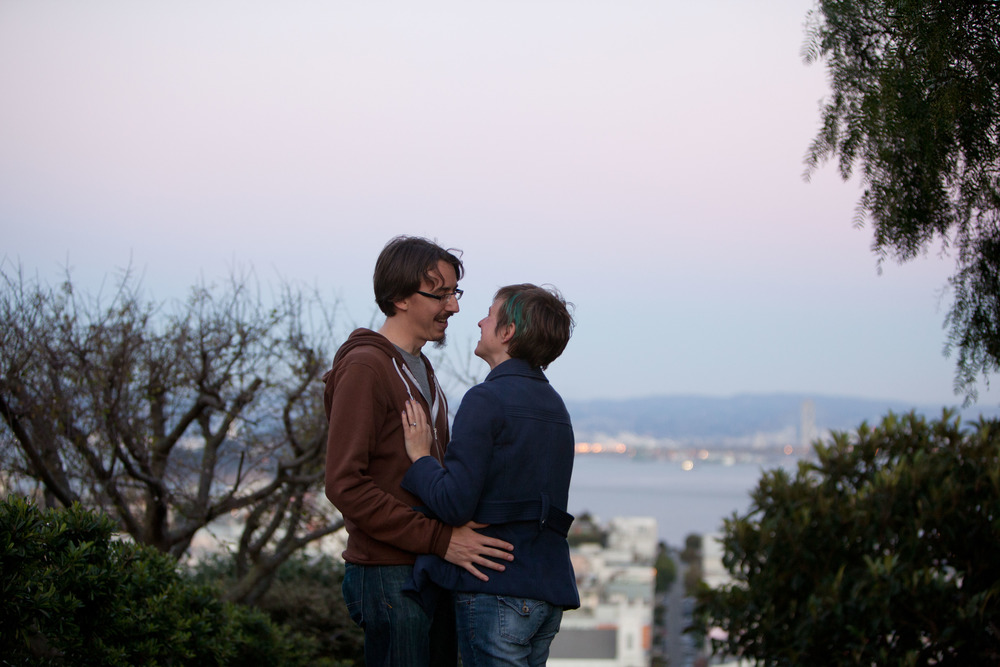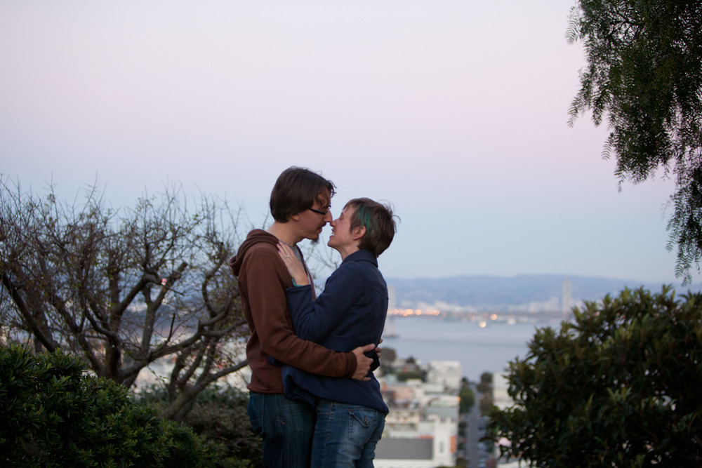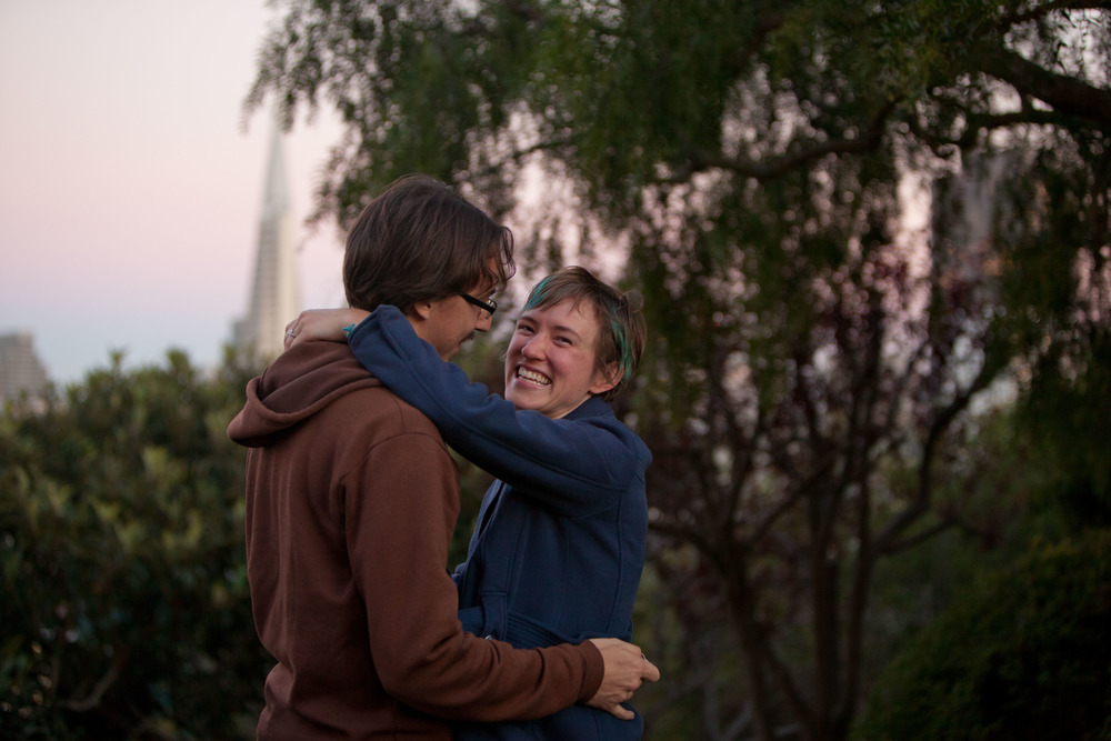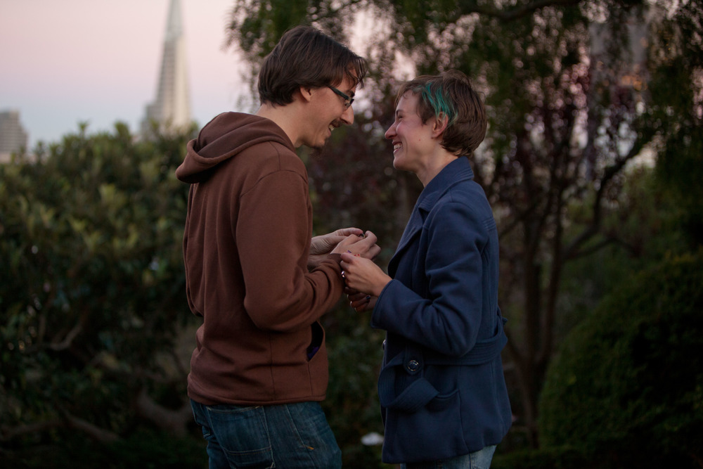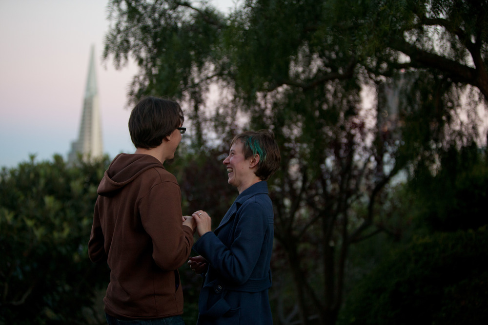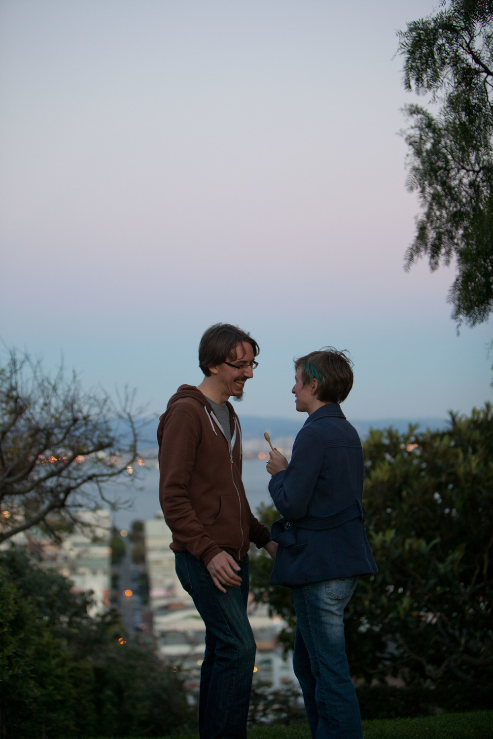 November 7, 2015 -- Maggie knows that the proposal is coming at some point in the next few weeks, but otherwise she’s in the dark about it all. We spend the day exploring SF, hiking around and finding cool spots, as we love to do. As the sun is setting, Maggie realizes that we are approaching our favorite hilltop park in SF, and she begins to suspect that something might be happening. As we stood in the park, gazing out over the bay, Isaac took Maggie’s hands, professed his love and joy in our relationship (admittedly, neither of us remember what he actually said. but it was definitely wonderful and romantic), and pulled a beautiful ring out of his pocket. After some joyful freaking out and taking pictures, Isaac revealed that not only had he made reservations at a fantastic restaurant, but he had sneakily stolen some of Maggie’s fancy clothes the previous week so that she would have a nice outfit to wear to dinner! Needless to say, Maggie was stunned and incredibly impressed, especially when she discovered that he has actually put together a very nice outfit. Dinner was wonderful, full of delicious food and a perfect way to end an incredible day.