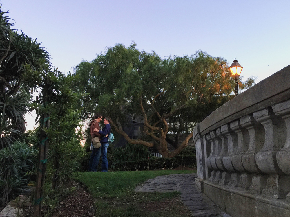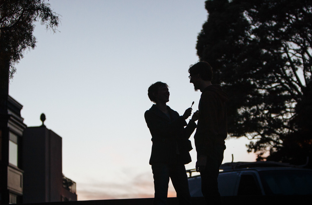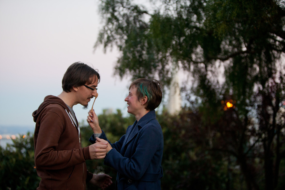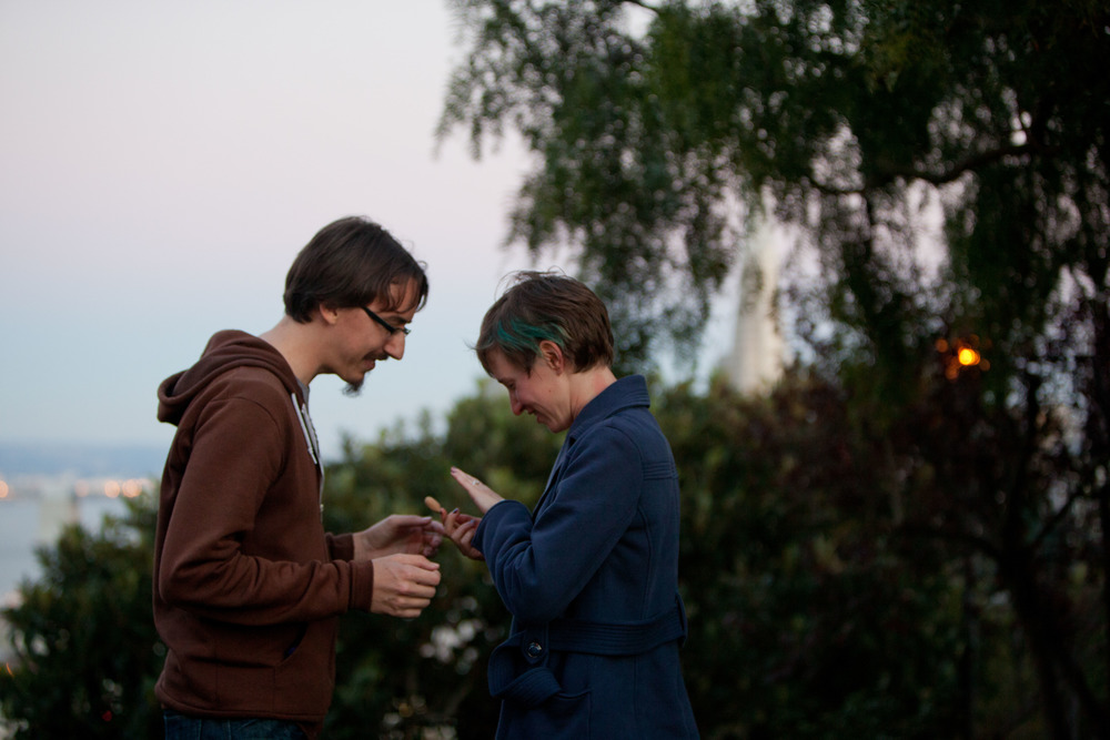November 7, 2015 -- Maggie knows that the proposal is coming at some point in the next few weeks, but otherwise she’s in the dark about it all. We spend the day exploring SF, hiking around and finding cool spots, as we love to do. As the sun is setting, Maggie realizes that we are approaching our favorite hilltop park in SF, and she begins to suspect that something might be happening. As we stood in the park, gazing out over the bay, Isaac took Maggie’s hands, professed his love and joy in our relationship (admittedly, neither of us remember what he actually said. but it was definitely wonderful and romantic), and pulled a beautiful ring out of his pocket. After some joyful freaking out and taking pictures, Isaac revealed that not only had he made reservations at a fantastic restaurant, but he had sneakily stolen some of Maggie’s fancy clothes the previous week so that she would have a nice outfit to wear to dinner! Needless to say, Maggie was stunned and incredibly impressed, especially when she discovered that he has actually put together a very nice outfit. Dinner was wonderful, full of delicious food and a perfect way to end an incredible day.